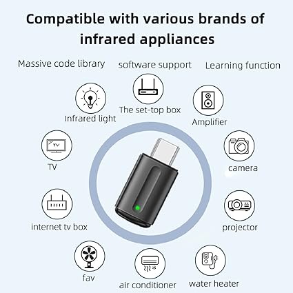 This compact Type C adapter turns your Android smartphone into a universal remote control using built-in infrared (IR) technology. It allows you to control IR-enabled devices like TVs, DVD players, refrigerators, lights, air conditioners, and more directly from your phone—no extra apps required for basic functions, though our companion app enhances customization.